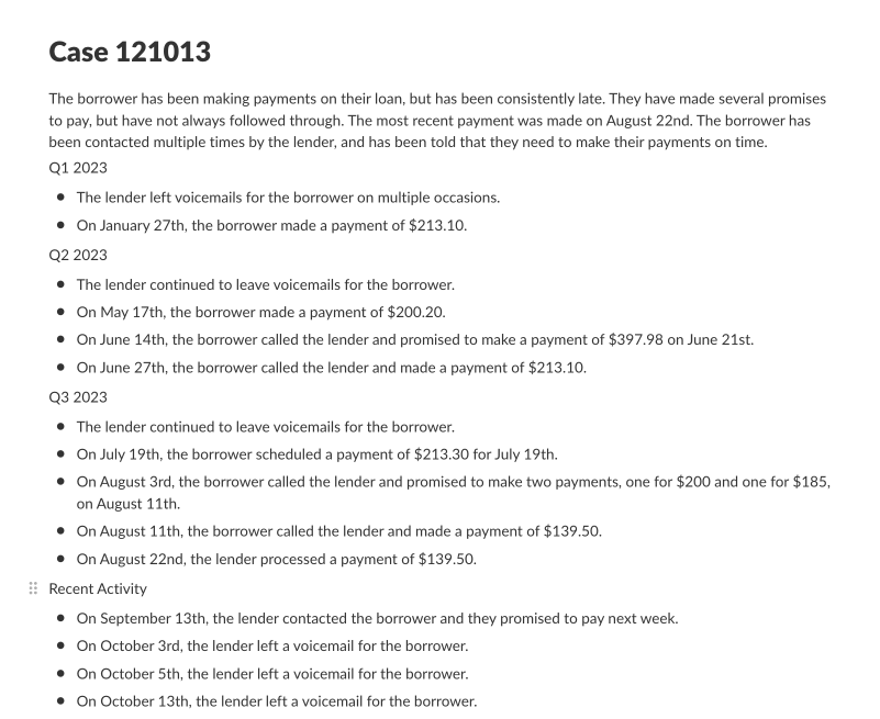 This is an especially important pain point in the context of collections, where it’s typical for multiple agents to work a single case and where cases may contain dozens or even hundreds of notes. Historically, agents have always reviewed each note to piece together a clear and accurate chronological picture of the case history and associated loans. This is a time-consuming and tedious process that’s susceptible to human error.