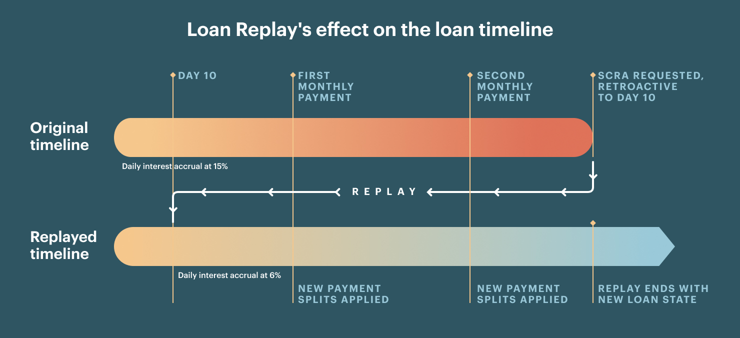 Loan Replay™ was built for use cases such as this. Broadly speaking, our architecture is built to keep detailed track of all mutable and interdependent events in the life of a loan, so that when any change is made to that event timeline or loan state, we can rewind to the time of the event in question, rewind the loan state, and create a new timeline in light of that change. In the case of SCRA, after handling interest rate changes and fee cancellations we reverse the state of the loan to the appropriate point in time, then replay the loan, recalculating the payment plan, re-accruing interest, re-applying payments and re-moving balances in light of the new reality, so that the present receives a new loan state.
