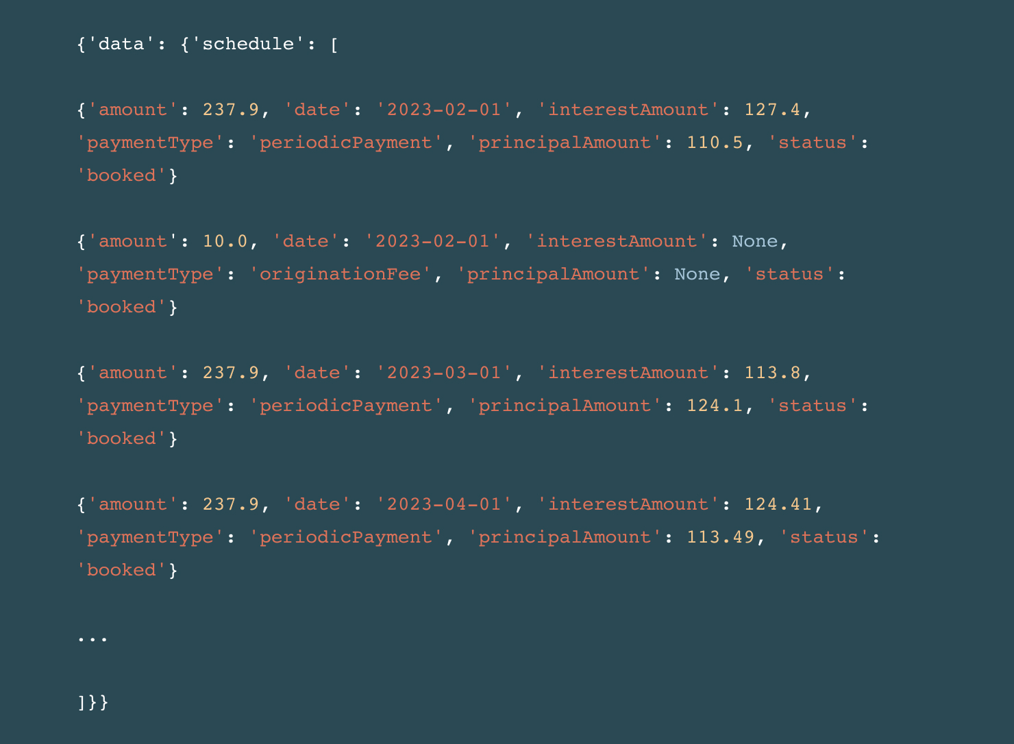 You’ll receive a response with either the actual post-SCRA adjusted payment plan or a preview of it. Below is a comparison of a payment plan prior to the SCRA adjustment, and the expected payments after the SCRA adjustment. The SCRA period is in effect for the first two months, and thus you will see the interest rates lowered to 6% in the response body (and the recurring amount due lowered by the amount of the interest rate reduction for the two relevant months). The origination fee has also been canceled.